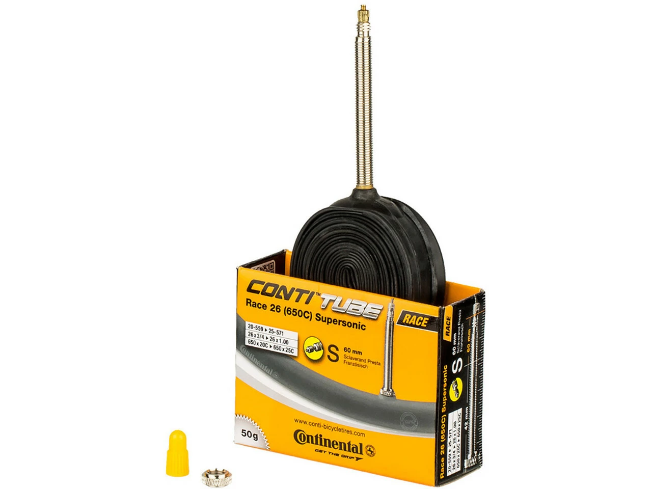 Désignation/synonymes : valve Sclaverand (SV), valve française, valve PrestaDiamètre extérieur : 6,5 mmAutres : la valve est dévissable sur toutes les chambres à air Continental avec valve SV (pour permettre l’utilisation d’un prolongateur de valve ou le remplissage avec un liquide anticrevaison, etc.).Contenu :1 x chambre à air Continental Race 26 Supersonic