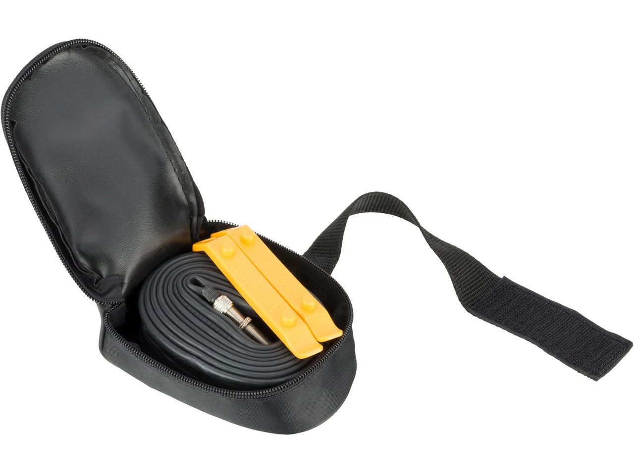 Sacoche avec une chambre à air Tour et deux démonte-pneus Tour.