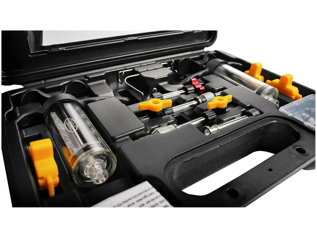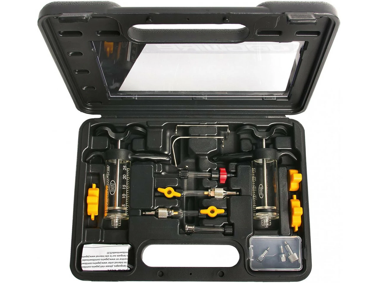 2 x seringue Jagwire Premium2 x adaptateurs universels Jagwire avec vanne d’arrêt1 x bloc de purge Jagwire pour 2 pistons1 x bloc de purge Jagwire 4 pistons 10,0 mm1 x bloc de purge Jagwire 4 pistons 11,8 mm1 x porte-seringue Jagwire droit1 x porte-seringue Jagwire coudé à 90 degrés1 x tuyau adaptateur pour douille de purge1 x adaptateur pour SRAM1 x adaptateur pour Formula1 x adaptateur pour Hayes série HFX1 x adaptateur pour Hope1 x coffret de rangement