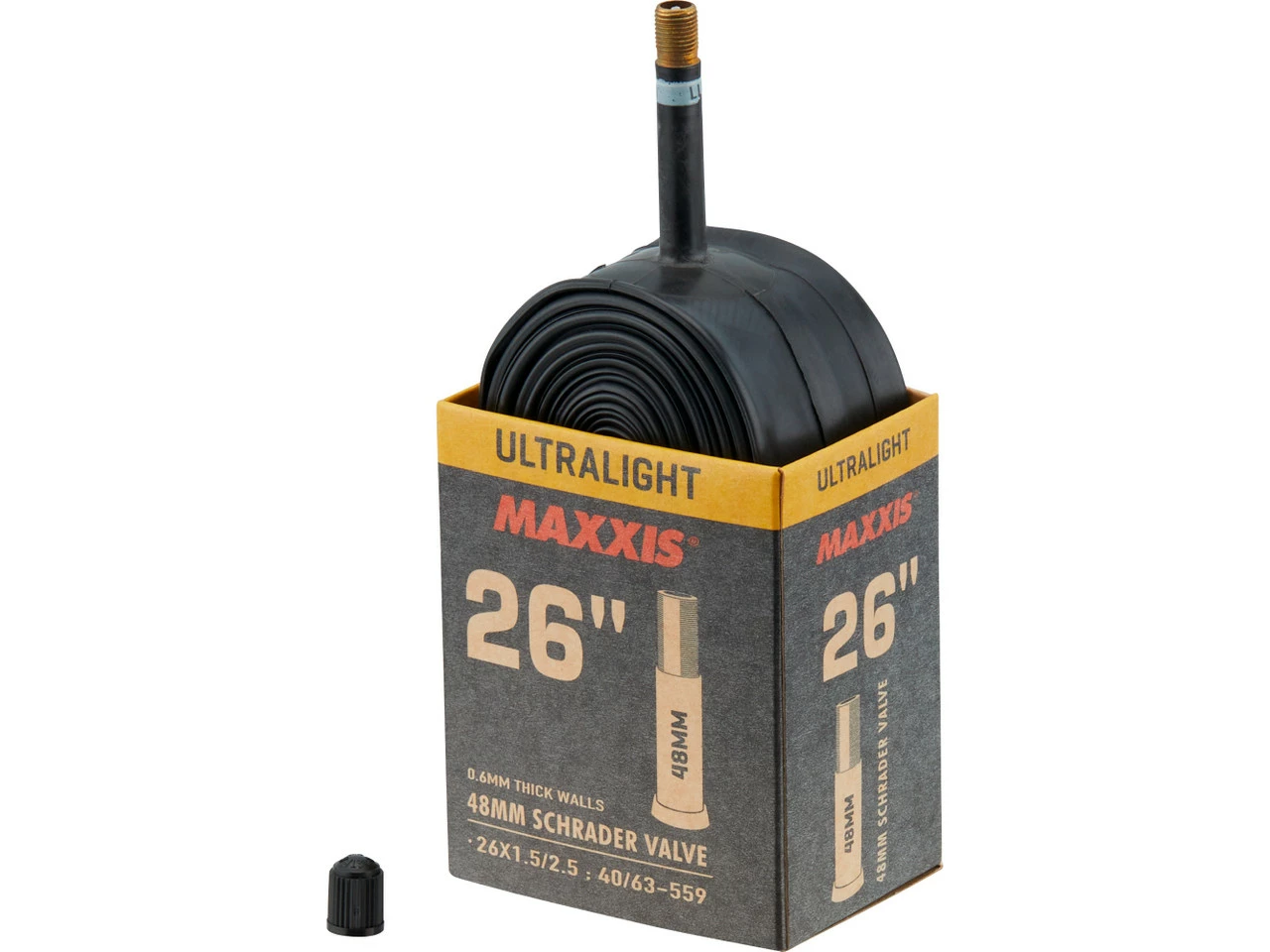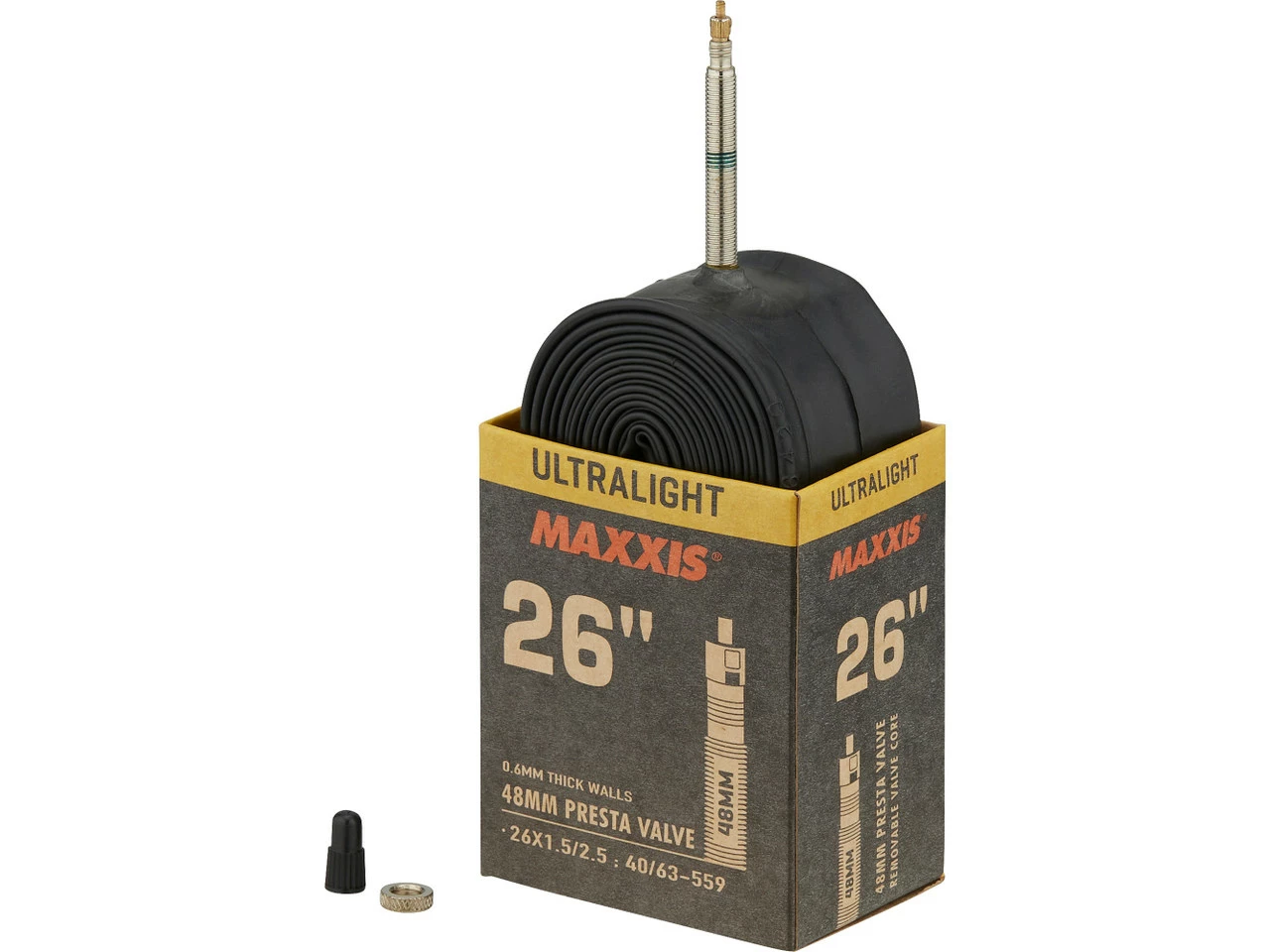 Avec une épaisseur de paroi de 0,60 mm, les chambres à air Maxxis Ultralight sont suffisamment résistantes pour les Worldcup les plus ardus, mais ne pèsent que la moitié du poids des chambres à air standard.