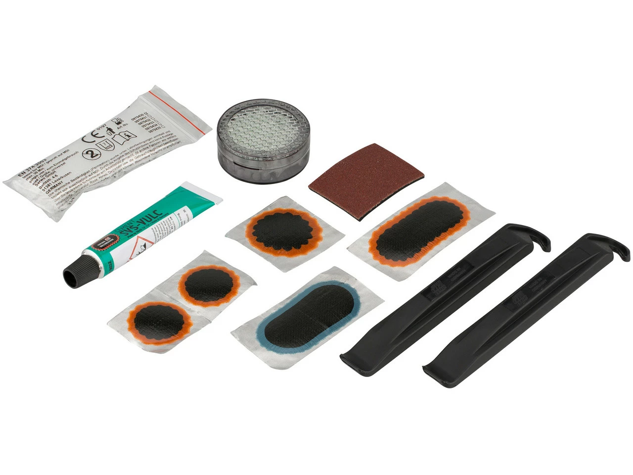 Contenu :2 x rustines Tip Top taille F1 (ø 25 mm)1 x rustine Tip Top taille 0 (ø 30 mm)1 x rustines Tip Top taille F2 (50 x 25 mm)1 x rustine Tip Top F2 bleue1 x liquide de vulcanisation, tube de 5 g1 x papier émeri avec pad spécial en caoutchouc2 x démonte-pneus en matériau synthétique1 x détecteur de crevaison1 paire de gants jetables